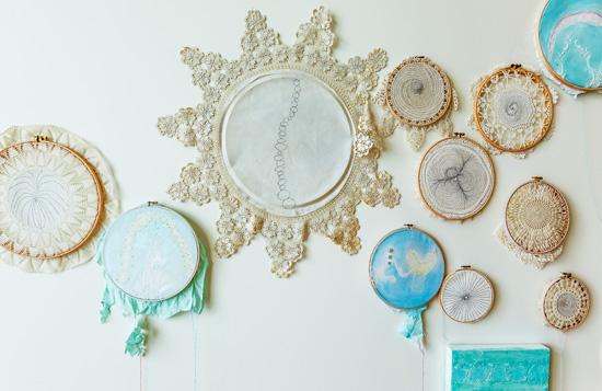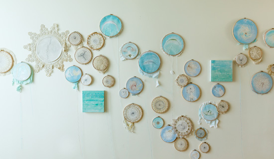 | 푸른 하늘(부분), 2003-2014, 262x228cm, 아크릴릭, 19세기 도일리, 쓰던 가정용 대마, 자수틀, 손 자수 & 혼합 재료 그림 |