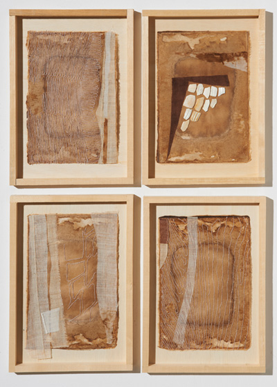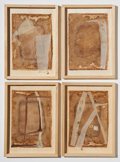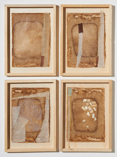 | 옛마음, 2013, 각각 30x42cm, 옷칠한 한지, 모시, 면사, 조개껍질조각(4) |