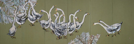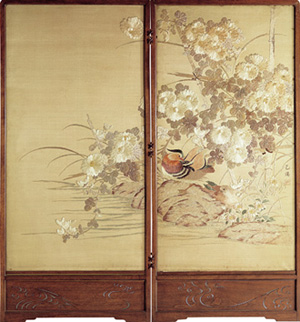 | 국화(菊花)와 원앙(鴛鴦), 1938년, 비단에 자수, 60×128㎝ 2폭 |