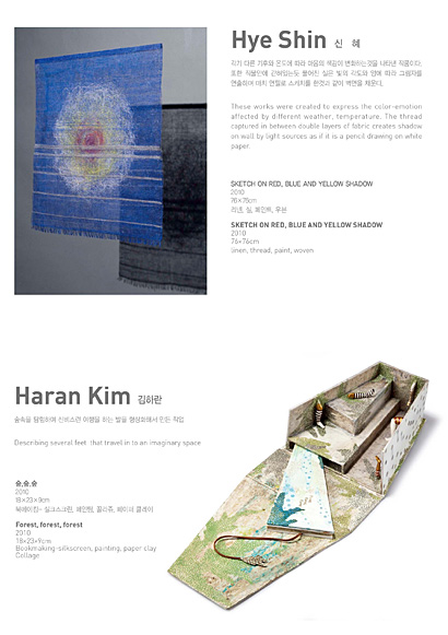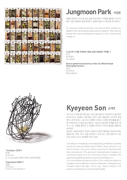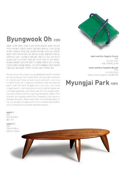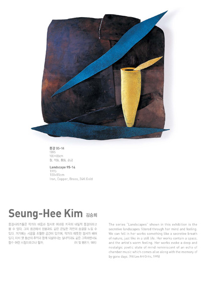 한국 금속공예의 발전에 기여해 온 1세대 금속공예가 김홍자와 김승희뿐만 아니라 손계연, 오병욱, 박명재는 단단하고 차가운 성질의 금속을, 오순희, 윤순란, 신혜, 박정문은 섬세하고 유연한 성질의 섬유를, 김하란은 판화와 북아트를 매체로 해서 작가 고유의 다양한 조형세계를 평면과 입체작품으로 선보이는 전시입니다.
