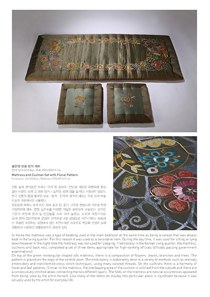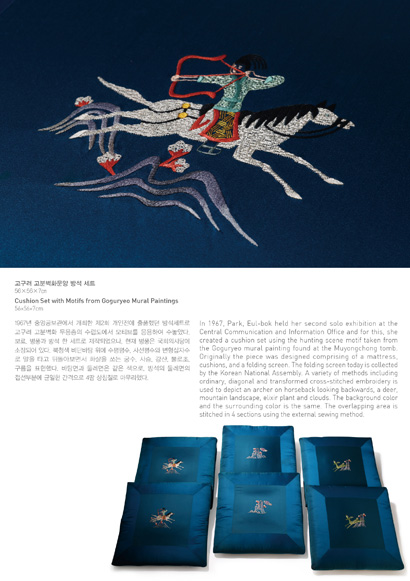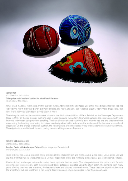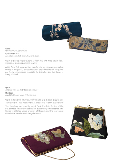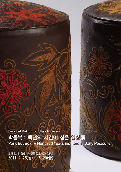 전시 제목인 ‘백년의 시간이 심은 일상’은 2011년 신묘년(辛卯年)해를 맞이하여 1915년 출생으로 토끼띠인 박을복 선생이 자수와 함께 해온 백년 가까운 시간의 흔적과 의미를 담고 있습니다. 일반 자수작품과 함께 박을복 선생께서 일상생활공간에서 즐겨 사용하기도 한 보료, 방석 세트와 쿠션 등 일상생활용품 20여 점과 핸드백, 안경집, 골무 등이 전시됩니다. 구겨진 보료의 주름, 쿠션, 낡은 가죽의자와 해진 골무의 흔적들을 통해 전통을 현대에 접목시키고자 불철주야 노력했던 예술가의 삶의 흔적을 엿볼 수 있으며 전통자수가 과거의 단순한 재연이 아니라 현대인의 생활속에 녹아있는 치열한 삶의 한 부분이라는 사실을 다시 한 번 확인시켜주고 있습니다.