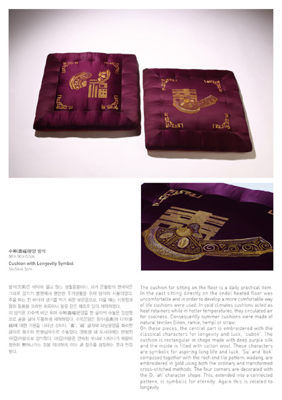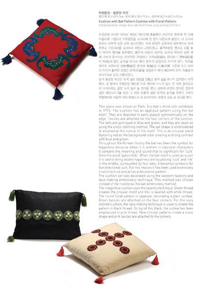 이번 전시에서는 와당(瓦當), 문자도(文字圖), 고구려벽화의 무용총(舞踊塚)에 나오는 수렵도(狩獵圖)와 연꽃, 박쥐 등 전통문양을 현대적으로 변형시켜 방석과 의자 등 각종 생활용품에 담은 작품들이 출품됩니다. 순수미술의 틀 안에서 공예가 추구할 수 있는 조형세계를 다양한 기법으로 표현한 작품들이 생활용품의 형태로 실체화돼 예술적 심미성(審美性)과 실용성(審美性)이 생활속에서 조화를 이루는 모습을 한 눈에 보실 수 있는 기회가 될 것입니다.