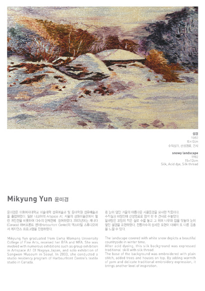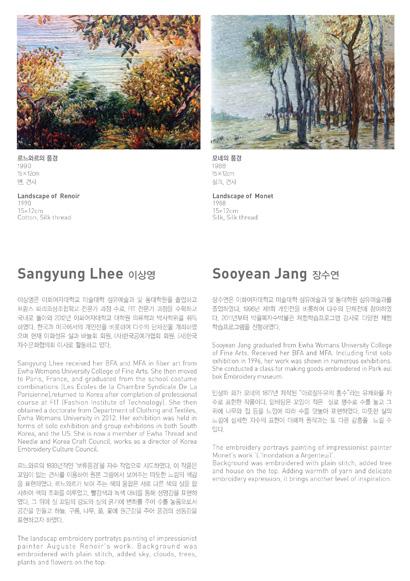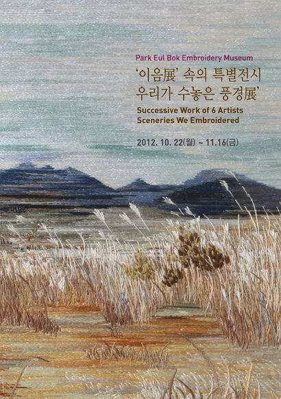 박을복자수박물관에서 2012년 가을 기획전으로 풍경자수를 매체로 하는 근·현대 섬유예술가 6인의 작품으로 구성된 ‘이음 展’ 속의 특별전시: 우리가 수놓은 풍경 展’을 개최합니다. 전시에 참여하는 박을복, 장영란, 박정례, 장수연, 이상영 작가의 전통에서 현대에 이르는 표현기법에 의한 풍경 자수 작품과 함께, 풍경의 일부로서 인체를 매개체로 한 윤미경, 윤순란 작가의 작품을 통해 자유로운 섬유예술의 세계를 살펴볼 수 있습니다.