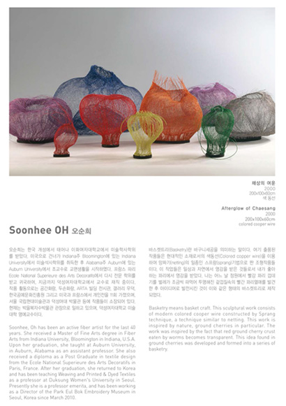질감과 물성을 주제에 맞게 이용한 평면, 부조, 입체 예술작품 등 폭넓은 섬유예술의 세계를 살펴 볼 수 있는 자리가 될 것입니다. |