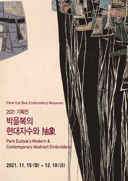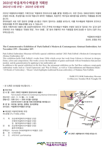 2021년 박을복자수박물관 기획전으로 ‘박을복의 현대자수와 抽象 展’을 개최합니다. 이번 전시는 1960년대부터 박을복 선생이 큐비즘, 추상형식을 자수에 적용시켜 제작한 작품들로, 독창적인 색구성과 배치형식을 보여주는 작품들을 준비했습니다.