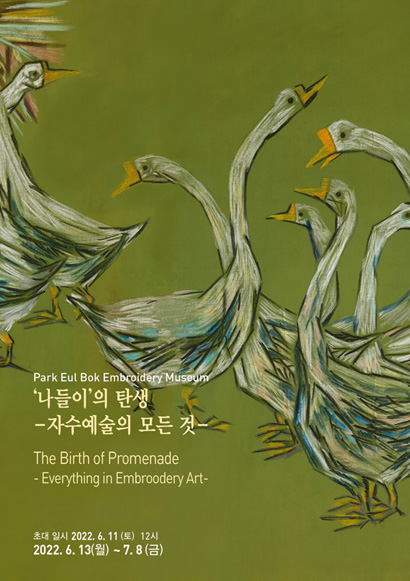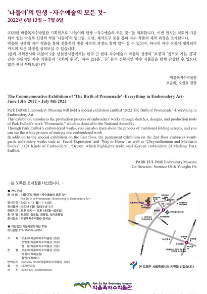 hhh 2022년 박을복자수박물관 기획전으로 ‘나들이의 탄생 -자수예술의 모든 것-’을 개최합니다. 이번 전시는 국회에 기증 되어 있는 박을복 선생의 작품 ‘나들이’의 밑그림, 도안, 제작도구 등을 통해 자수 작품의 제작 과정을 소개합니다.
